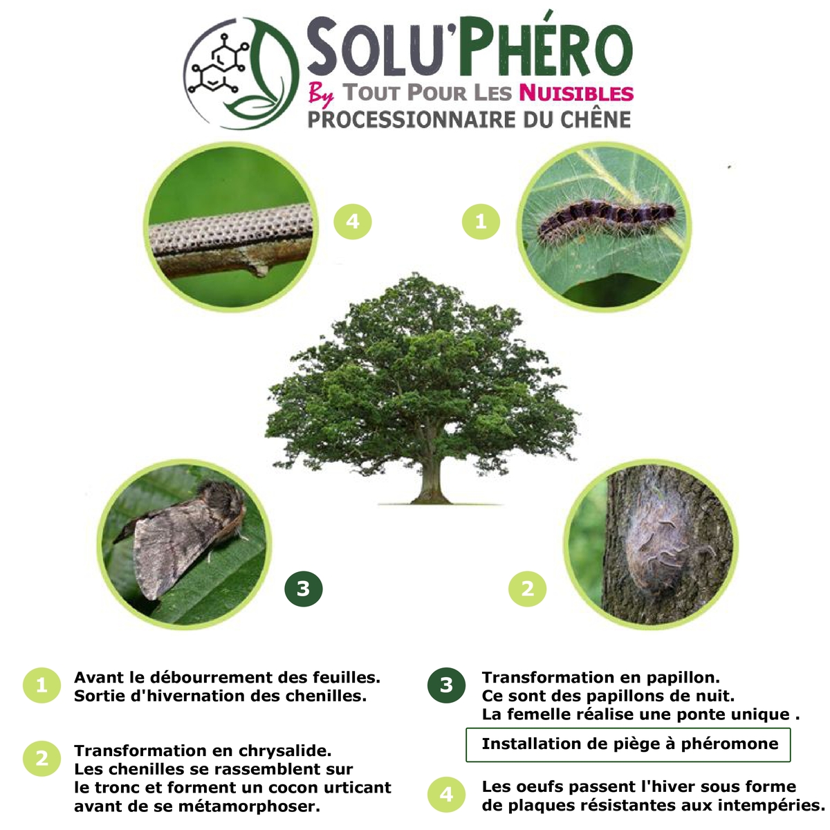 6 Phéromones pour attirer et capturer le papillon mâle de la processionnaire chêne, Thaumetopoea processionea La processionnaire du chêne est un nuisible forestier dont les chenilles se nourrissent du feuillage des chênes, provoquant un affaiblissement de l’arbre et une baisse de sa vigueur. Le papillon adulte, de teinte grisâtre ou brun clair, n’est pas dangereux en soi, mais joue un rôle crucial dans la reproduction de l’espèce. Les chenilles, couvertes de poils urticants microscopiques, représentent un véritable risque sanitaire pour l’homme et les animaux : elles peuvent provoquer démangeaisons, réactions allergiques et irritations oculaires ou respiratoires.La gestion de cet insecte passe par une stratégie intégrée : retrait manuel des nids, traitements biologiques (comme le Bacillus thuringiensis) et piégeage des papillons mâles grâce à des phéromones. Cette dernière méthode, simple et efficace, vise à perturber le cycle de reproduction. La capsule de phéromone attire les papillons mâles vers un piège, empêchant ainsi la fécondation des femelles. Moins de papillons = moins de chenilles = moins de risques. Cette phéromone est biodégradable et sans danger pour l'homme et l'environnement. Produit 100% vert et biodégradable.   Conditionnement : 1 boite de 6 Pheromones Attention : Vendu sans le piège Funnel Trap Attention il est obligatoire de placer la phéromone dans un piège de type Entonnoir (Ex. Funnel Trap)  Attention : le piège est non inclus Efficacité : 4 à 6 semaines    Comment utiliser les phéromones pour lutter contre la mineuse du marronnier  ? Identifier le problème Dommages au feuillage : Les premiers signes d’infestation apparaissent sur les feuilles des chênes, qui sont partiellement ou totalement consommées par les chenilles. Cette défoliation répétée affaiblit considérablement l’arbre, ralentit sa croissance et le rend plus vulnérable aux maladies ou aux sécheresses. Les jeunes arbres peuvent être gravement affectés. Présence de chenilles : Les larves de la processionnaire du chêne vivent en groupes compacts sur les branches, puis descendent en file indienne à la recherche d’un lieu pour se nymphoser dans le sol. Recouvertes de poils urticants microscopiques, elles représentent un danger sanitaire sérieux pour l’homme et les animaux, même sans contact direct. Nids soyeux : Contrairement à la processionnaire du pin, dont les nids se trouvent en bout de branches, la processionnaire du chêne construit ses nids directement sur le tronc. Ces amas soyeux blancs à bruns, parfois volumineux, sont un indicateur clair de colonisation.  Présence de papillons : Les adultes émergent en été, généralement entre fin mai- fin août. Ce sont des papillons nocturnes gris-brun au vol discret, dont la seule mission est la reproduction. Ils ne se nourrissent pas et vivent quelques jours seulement, mais leur capture à l’aide de phéromones est essentielle pour rompre le cycle biologique de l’insecte.   Comment les phéromones agissent-elles? Une fois la phéromone mise en place, celle-ci va reproduire et diffuser une phéromone sexuelle identique à celle du papillon femelle.  Les papillons mâles attirés par la phéromone pénètrent dans le piège et tombent dans l’eau finissant par se noyer.   Cycle biologique de la processionnaire du chêne   Conservation :  le diffuseur doit être conservé dans son emballage d'origine et au réfrigérateur à 4 °C pendant 2 ans ou au congélateur à -18 °C pendant 5 ans.  Période d'utilisation : Le piège doit être placé de fin mai à fin août selon les conditions climatiques de l'année et de votre région. Mode d'emploi  ·Placer le piège dans la canopée de l'arbreà partir de 3 m ou plus, mais toujours en zone ensoleillée et dégagée. ·Prévoir 1 piège tous les 20 arbres ou un piège tous les 100 mètres. ·Remplir le bocal du piège de 0.5 l d’eau et deux gouttes d’huile, de liquide vaisselle non-odorant ou du savon noir non odorant pour empêcher l'eau de s'évaporer et de facilité la noyade des papillons. ·Placer le panier à phéromone sur le couvercle vert et mettre la phéromone dans le fond du panier à phéromone vert (SANS TOUCHER LA PHEROMONE) puis refermer le panier à phéromone avec son opercule de fermeture.                                ·Disposez le piège dans le chêne.                                                                                                                                ·Les papillons mâles attirés par la phéromone pénètrent dans le piège et tombent dans l’eau savonneuse.                                                                                                                                                         ·Vérifiez visuellement s’il reste de l'eau dans le seau sinon en remettre sans toucher à la phéromone.                    ·Fin Août, enlever le piège, le nettoyer à l'eau et le conserver pour la saison prochaine où vous devriez mettre une nouvelle dose de phéromone. ·Jeter la phéromone aux ordures ménagères.   Mode d'action : Les papillons mâles attirés par la phéromone sexuelle femelle, fatigué de ne pas trouver la femelle, ils finissent par tomber dans le piège et sont capturés. Pour quels nuisibles ? Cette phéromone est spécifique au piégeage des papillons mâles de la processionnaire du chêne Avantages  La mise en place est rapide et simple. Elle permet la détection et contrôle des populations. Cette phéromone est sans danger pour l'homme et l'environnement. Une technologie verte sans solvant, bio sourcée et biodégradable. Précaution d'utilisation  Les capsules ne doivent pas être manipulées avec les mains pour éviter de «polluer» la phérom